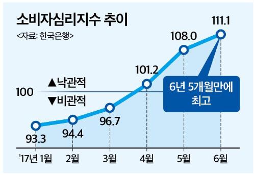 27일 한국은행이 발표한 '2017년 6월 소비자동향조사 결과'에 따르면 이달 소비자심리지수(CCSI)는 111.1로 2011년 1월(111.4)이후 6년5개월만에 가장 높았다. 소비심리는 올 2월부터 5개월 연속 오름세다.