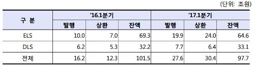 특히 ELS의 상환 급증 영향이 컸다. ELS 발행액은 19조9000억원으로 1년 전보다 9조9000억원(99.0%) 크게 늘었다. 대부분이 주가지수를 기초자산으로 하는 지수형 ELS였다. 그러나 ELS 상환액은 24조원으로 17조원(242.9%) 급증했다. 유로스톡스50, 홍콩항셍중국기업지수(HSCEI) 등 주요지수 가격이 상승하면서 조기상환 규모가 늘었기 때문이다. 상환액의 86.7%가 조기상환 물량이었다. 1분기말 ELS 발행잔액은 상환액 증가에 따라 전년 동기 대비 6.8% 감소한 64조6000억원으로 집계됐다.