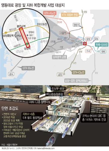 기본계획에 따르면 오는 2023년 2호선 삼성역과 9호선 봉은사역 사이에 있는 강남구 영동대로 하부에 복합환승센터와 지하도시가 지하 6층, 연면적 16만㎡ 규모로 들어선다. 상부에는 서울광장의 약 2.5배 크기의 대형광장이 만들어진다. 2021년 완공 예정인 현대차 글로벌비즈니스센터(GBC)를 포함하면 광화문광장보다 큰 대형 시민광장이 자리를 잡게 된다.