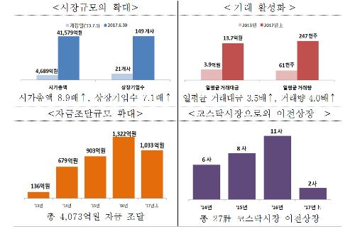 특히 자금조달 창구로의 기능을 수행해 코스닥으로의 이전 상장을 지원했다. 자금조달규모는 개장 이후 총 4073억원을 조달했고, 지난 4년간 27사가 코스닥으로 이전 상장을 완료했다.