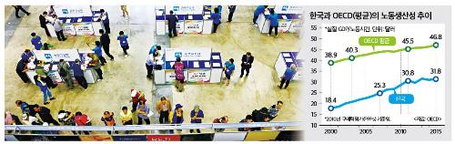 이는 노동생산성 개선이 정체되고 있기 때문이다. 2010년 기준 구매력평가 실질 국내총생산(GDP)을 노동시간으로 나눈 노동생산성은 2000년 18.4달러에서 2015년 31.8달러로 13.4달러 상승했다. 문제는 2011년 30.8달러로 30달러대에 진입한 이후 5년 간 1달러 정도 상승한데 그쳤다는 점이다. 특히 2015년 OECD 평균 노동생산성 46.8달러에 비해서는 약 15달러 낮고, OECD 평균의 약 68% 수준에 불과한 수준이다.