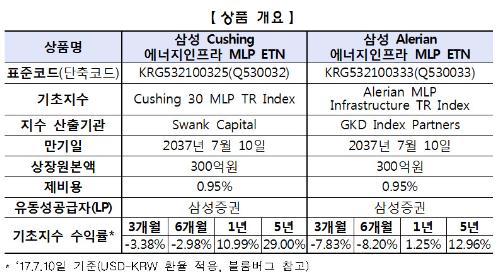 '삼성 Cushing 에너지인프라 MLP ETN'과 '삼성 Alerian 에너지인프라 MLP ETN' 상품 개요. 자료/한국거래소