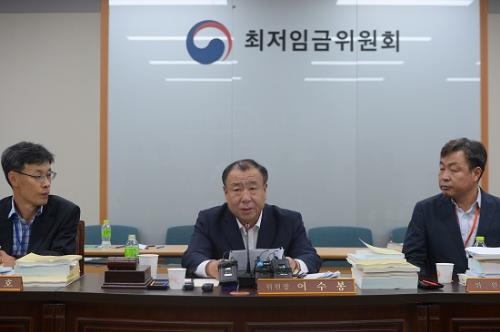 15일 밤 정부세종청사 고용노동부 최저임금위원회 전원회의에서 내년도 최저임금이 7530원으로 확정된 가운데 어수봉 위원장이 최저임금에 대한 브리핑을 하고 있다. 사진/뉴시스