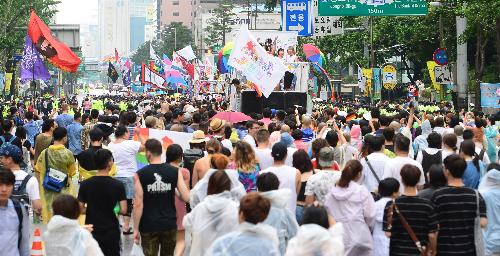 퀴어문화축제조직위원회는 지난 14일 오후 7시30분 서울광장에서 ‘퀴어 야행(夜行), 한여름 밤의 유혹’을 주제로 개막식을 열었다. 15일에는 퀴어 퍼레이드로 도심이 무지개 색으로 뒤덮였다. 무지개 색 깃발·우산 등이 거리를 물들였다. 무지개 색은 다양성의 상징인 성소수자들을 의미한다. 올해 18회째를 맞는 퀴어문화축제 주제는 ‘나중은 없다, 지금 우리가 바꾼다’였다. 동성애 결혼을 ‘지금’ 합법화하고, 군대 내 동성애 처벌 금지를 ‘지금’하자는 주장이다.