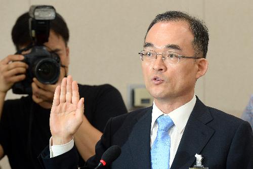 24일 오전 서울 영등포구 여의도 국회 법제사법위원회 회의실에서 진행된 검찰총장후보자(문무일) 인사청문회에서 문무일 후보자가 선서를 하고 있다. 사진/뉴시스