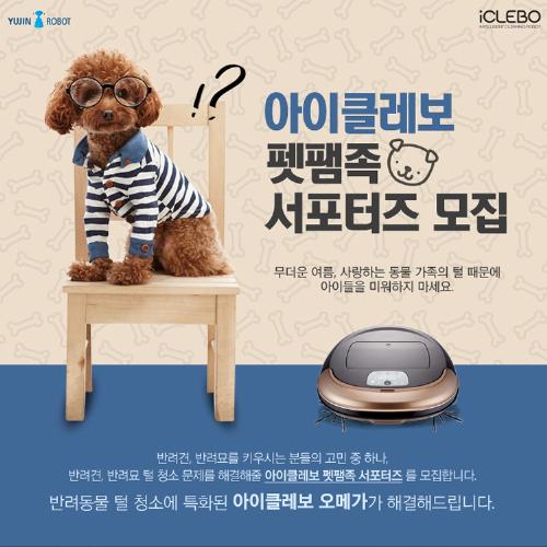 아이클레보 펫팸족 서포터즈 모집은 반려동물 털 청소에 체력적?시간적 어려움을 겪는 펫팸족 가정의 청소부담을 덜어주고자 기획됐다. 이번 서포터즈에 선정되면 반려동물 털 청소에 특화된 유진로봇의 프리미엄 로봇청소기 '아이클레보 오메가'를 체험할 수 있다.