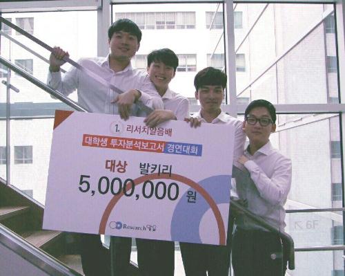 총 상금 1000만원을 걸고 진행된 이번 대회에서는 성균관대학교 발키리팀(정길호 곽호인 장대익 이태희)이 대상을 수상했다. 발키리팀은 문재인 정부의 에너지 정책 기조에 맞춰 신재생 에너지 관련 수혜주로 이테크건설을 지목하는 분석보고서를 제출해 대상 수상의 영광을 안았다. 발키리팀은 "신정부가 친환경 에너지 사업을 적극적으로 육성한다는 방침을 세우며 RPS(신재생에너지 의무할당제도)를 2030년까지 28%로 확대키로 했다"며 "REC(신재생에너지 공급인증서)를 판매하는 이테크건설의 수혜가 기대된다“고 분석했다.