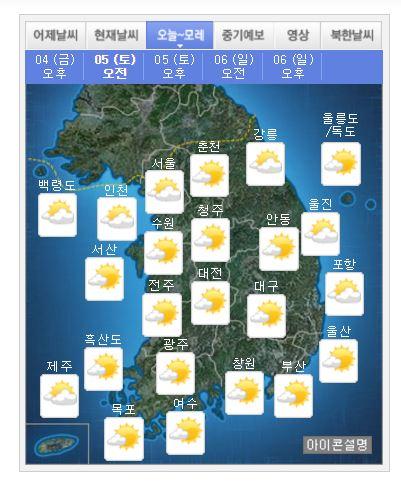 토요일(5일)은 전국에 구름이 많겠으나 아침 최저기온은 23~26도, 낮 최고기온 34~36도를 보이겠다. 다만, 충청내륙과 남부 내륙에는 대기 불안정으로 오후에 소나기가 오는 곳이 있겠다.