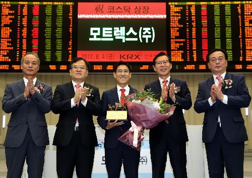 모트렉스가 코스닥 상장 첫날 공모가 하회라는 실망스러운 성적표를 받았다. 사진은 모트렉스 상장 기념식 모습. 사진/한국거래소