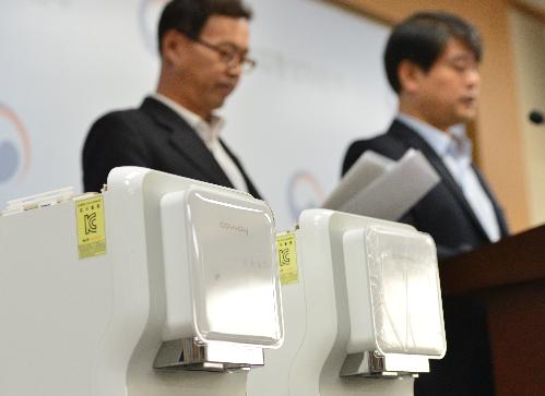 산업통상자원부와 환경부, 한국소비자원이 지난해 9월 코웨이 3종 얼음정수기에서 증발기의 니켈도금이 떨어진 제품결합의 원인이 증발기와 히터 등으로 구성된 냉각구조물의 구조, 제조상 결함문제로 드러났다고 발표하고 있다. 사진제공=뉴시스
