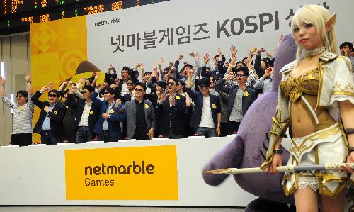 넷마블게임즈가 24일 8% 넘게 상승하며 공모가 15만7000원 회복을 눈앞에 두고 있다. 사진은 지난 5월12일 진행된 넷마블게임즈의 유가증권시장 신규상장기념식 모습. 사진/한국거래소