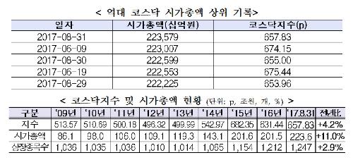 31일 한국거래소는 코스닥의 시가총액이 223조6000억원을 기록하며 지난 6월9일 이후 사상 최고치를 넘어섰다고 밝혔다.