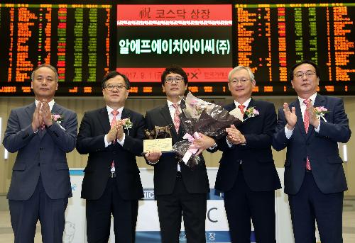 RFHIC가 스팩합병 첫날 주가가 하락하면서 거래를 마쳤다. 사진은 지난 1일 한국거래소에서 진행된 RFHIC의 코스닥 시장 상장 기념식 모습. 사진/한국거래소