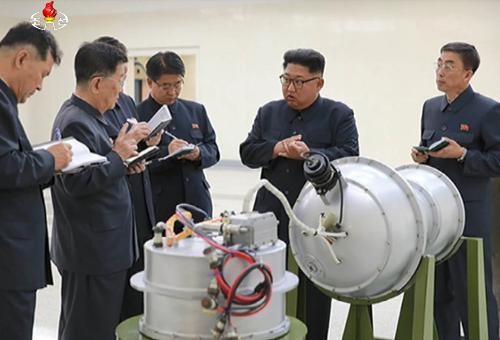 조선중앙TV가 지난 3일 김정은 노동당 위원장이 핵무기연구소를 방문해 관계자들과 함께 화성-14형'의 '핵탄두(수소탄)을 시찰하고 지도하는 모습을 보도한 장면. 사진/뉴시스