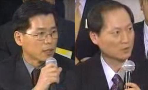 허상구 전 청주지검 차장(왼쪽)과 이완규 전 인천지검 부천지청장이 2003년 3월 열린 '전국 검사들과의 대화' TV토론회에서 노무현 당시 대통령에게 질의하고 있다.