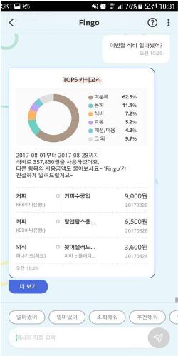 핀크의 인공지능 채팅로봇과 대화하며 식비 지출내역을 확인하는 모습. 사진/SK텔레콤