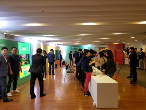 4일 SK텔레콤과 하나금융그룹이 서울 중구 을지로 KEB하나은행 명동 본점 4층 대강당에서 '핀크'를 출시 기자설명회를 열었다. 행사장에 마련된 핀크 체험장에서 사람들이 핀크에 대한 설명을 듣고 있다. 사진/뉴스토마토