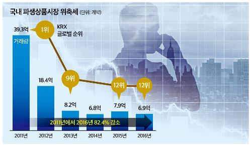 파생상품은 금융자산의 가격변동 위험에 대한 일종의 관리수단의 역할을 하는데, 국내에는 주가지수 선물·옵션, 변동성 선물, 금리선물, 통화선물, 돈육, 금선물 등이 상장돼 있다. 2011년 글로벌 1위(39억3000만계약)를 자랑하던 한국 파생상품시장 거래량은 작년 6억9000만계약으로 82.4%나 줄면서 12위권으로 내려앉았다. 같은 기간 대표 파생상품인 코스피200선물·옵션 거래량은 2011년 37억6000만계약에서 3억7000만계약으로 90.2%나 감소했다.