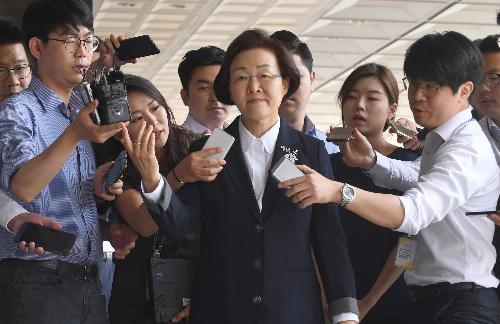 문재인 당시 더불어민주당 대선후보에 대한 비방글을 올린 혐의를 받고 있는 신연희 강남구청장이 지난 6월21일 오전 서울 서초구 서울중앙지검에 출석해 취재진 질문을 듣고 있다. 사진/뉴시스