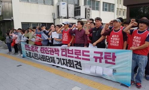 희망연대노조티브로드비정규직지부와 태광그룹바로잡기공동투쟁본부, 진짜사장재벌책임공동행동 등 시민단체는 27일 서울 장충동 태광산업 앞에서 기자회견을 열고 "태광그룹은 티브로드 원·하청 노동자 문제 해결을 위해 진정성 있게 나서라"고 요구했다. 티브로드 사태의 진짜 책임자는 태광그룹이며, 사주인 이호진 전 회장만이 문제를 해결할 수 있다는 판단에서 회견 장소를 태광산업 앞으로 정했다.