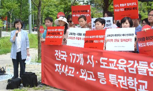 '전국 시·도교육감협의회'가 열린 지난 7월19일 서울 서초구 더케이호텔 앞에서 '사교육걱정없는세상'의 윤지희 공동대표가 '자사고·외고 등의 일반고 일괄 전환' 결의를 촉구하는 발언을 하고 있다. 사진/뉴시스
