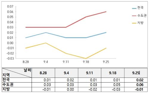 서울은 가을이사철 진입과 일부 재건축 단지 사업진척 영향 등으로 강북권과 강남권 모두 상승했다. 강남권(0.12%↑)은 서초구는 8.2대책 조합원지위 양도제한으로 재건축단지 중심으로 하락세 여전하나, 송파구는 도시계획위원회 통과 호재로 인근 단지에서 국지적으로 상승하고 금천구는 가을이사철 수요로 상승했다.