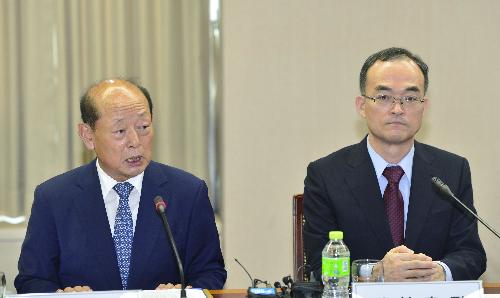 문무일(오른쪽) 검찰 총장이 지난 19일 서울 서초구 대검찰청에서 열린 검찰개혁위원회 발족식에서 위원장인 송두환 전 헌법재판관의 인사말을 듣고 있다. 사진/뉴시스