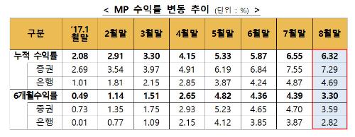 전체 대상 MP의 약 55%인 113개 5% 초과 수익률을 기록했고, 약 17%인 34개는 10% 초과 수익을 달성했다. 초고위험 MP 25개는 최대 22.1%에서 최소 5.6%의 수익률을 기록해 평균수익률은 12.6%로 나타났다. 고위험 9.0%, 중위험 5.4%, 저위험 3.0%, 초저위험 1.8% 등으로 모든 유형의 평균수익률이 플러스로 준수한 성과를 기록 중이다.