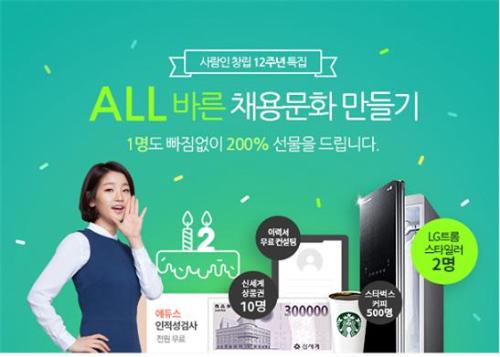 사람인에이치알(143240)이 운영하는 사람인(www.saramin.co.kr 대표 이정근)이 창립 12주년을 맞아 ‘ALL바른 채용문화 만들기’ 이벤트를 진행 중이다.