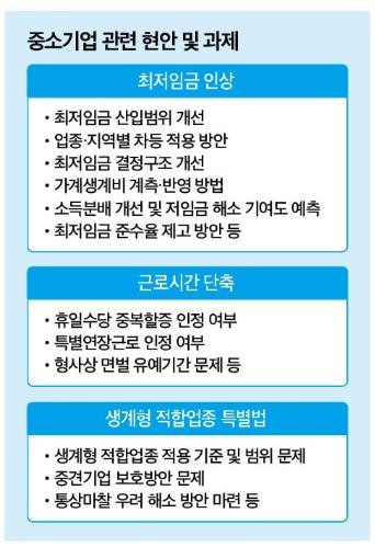 업계 현안이 충분히 다뤄질지 의문이라는 시각도 있다. 현재 중기업계 관심사로는 최저임금 인상과 관련한 최저임금 산입 기준 마련, 업종·지역별 차등 적용 방안, 최저임금 결정구조 개선 등이 있다. 근로시간 단축과 관련해선 인력난 문제와 납기 문제 해결방안, 휴일수당 중복할증 인정 여부, 특별연장근로 인정 여부, 형사상 면벌 유예기간 문제 등에 대한 논의가 시급한 과제다. 또 생계형 적합업종 특별법과 관련해 적용 범위 및 기준 문제, 중견기업 보호방안 마련, 통상마찰 우려 해소 방안 마련 등이 주요과제로 꼽힌다.