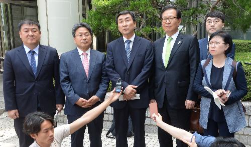 지난 7월6일 서울 서초구 서울중앙지방법원 앞에서 국정원 여직원 감금 혐의에서 무죄를 선고 받은 이종걸(가운데) 더불어민주당 의원을 비롯한 전·현직 의원들이 소감을 말하고 있다. 오른쪽부터 김현 전 의원, 문병호 전 의원, 이 의원, 강기정 전 의원. 사진/뉴시스