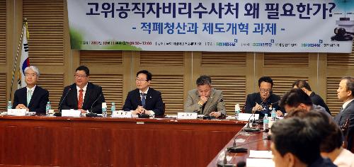 지난 11일 오전 서울 영등포구 여의도 의원회관에서 진행된 더불어민주당 적폐청산위원회 토론회 ‘고위공직자 비리수사처 왜 필요한가? 적폐청산과 제도개혁 과제‘에서 임수빈(왼쪽 두번째) 변호사가 발언을 하고 있다. 사진/뉴시스