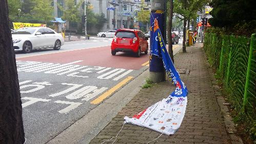 전북 전주시의 한 아파트 단지 앞에 걸린 불법 현수막이 찢어진 채 방치돼 있다. 사진/뉴시스