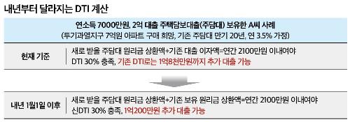 그러나 신DTI가 도입되는 내년부터는 여기에 기존 대출의 원리금을 상환기간(20년)으로 나눈 1000만원도 함께 반영한다. 만약 그가 투기과열지구에 포함된 서울지역에서 7억원짜리 주택을 추가로 구입할 경우 기존 DTI로는 1억8000만원까지 대출이 가능하지만 내년에는 신DTI를 30%만 적용받아 1억원 가량만 대출 받을 수 있다.