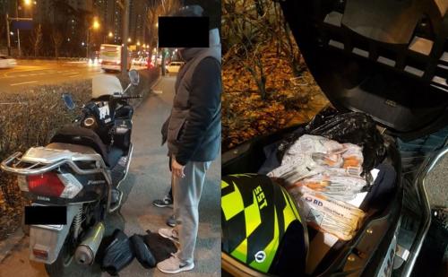 서울지방경찰청 광역수사대 마약계 경찰관이 속칭 '던지기' 수법으로 오토바이 안장에 숨겨 놓은 필로폰을 확보하고 있다.