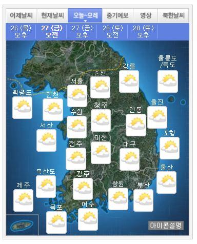 26일 기상청에 따르면 내일 아침 기온은 ▲서울·경기 12도 ▲경남 14도 ▲경북 9도 ▲전남 11 ▲전북 10도 ▲충남 10도 ▲충북 10도 ▲강원 영서 9도 ▲강원 영동 12도 ▲제주 15도 등으로 예상된다.