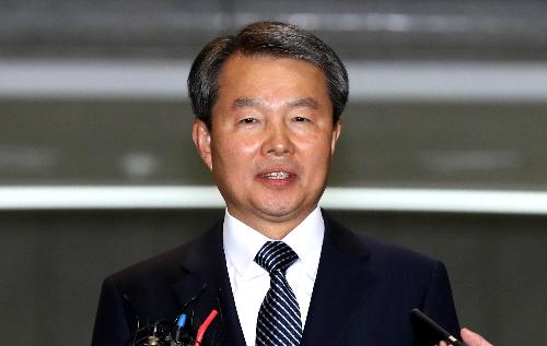 헌법재판소장 후보에 지명된 이진성 헌법재판관이 27일 오후 서울 종로구 헌법재판소에서 퇴근하며 취재진의 질문에 답변하고 있다. 사진/뉴시스