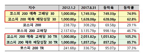 두 지수를 지난 2012년 12월을 기준으로 수익률을 산출한 결과, 코스피 200 지수 및 코스피 200 고배당지수 보다 높은 것으로 나타났다. 코스피 200 지수의 등락률은 29.1%, 코스피 200 고배당지수의 등락률은 46.7%였으나, 코스피 200 예측 고배당 30 지수는 74.9%, 코스피 200 예측 배당성장 30 지수는 62.8%의 수익률을 기록했다.