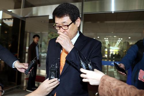 자유한국당 이군현 의원이 3일 오전 서울 양천구 서울남부지법에서 열린 정치자금법 위반 1심 선고를 마치고 취재진에게 질문을 받고 있다.사진/뉴시스