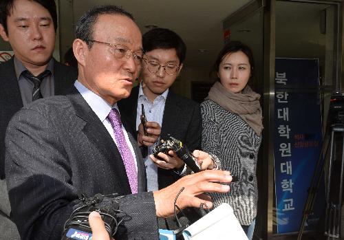 송민순 전 외교부 장관이 지난 4월24일 오전 서울 종로구 북한대학원대학교로 출근하던 중 취재진 질문에 답하고 있다. 사진/뉴시스