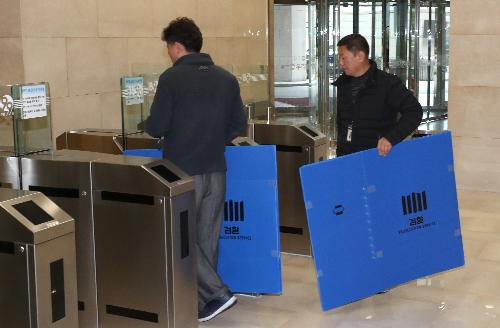 검찰이 우리은행 채용비리 의혹과 관련해 우리은행 본점을 압수수색을 하고 있는 7일 오전 서울 중구 회현동 우리은행 본점으로 검찰 관계자들이 박스를 들고 들어서고 있다. 사진/뉴시스