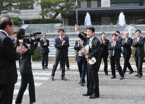 김용헌 헌법재판소 사무처장이 8일 퇴임식을 마치고 청사 정문을 나서기 전 직원들과 작별의 인사를 나누고 있다. 사진/헌법재판소
