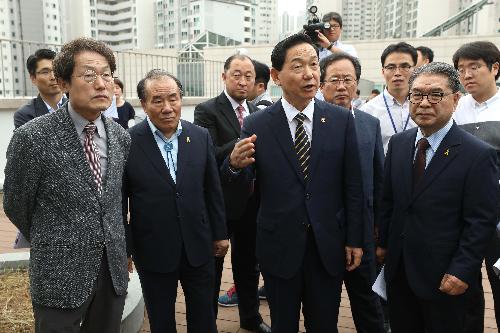 김상곤 사회부총리 겸 교육부 장관과 이재정 전국시도교육감협의회장, 조희연 서울시교육감이 지난 8월28일 오후 서울 강북구 삼각산고등학교에서 열린 교육자치정책협의회에 앞서 햇빛발전소를 살펴보고 있다. 사진/뉴시스