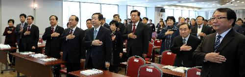 하윤수 한국교원단체총연합회장과 성낙인 서울대학교 총장을 비롯한 참석자들이 9일 오후 서울 서초구 한국교원단체총연합회회관에서 열린 ‘한국교총 70년의 성찰과 미래 대한민국 교육 30년의 길’ 교육대토론회에서 국민의례를 하고 있다. 사진/뉴시스