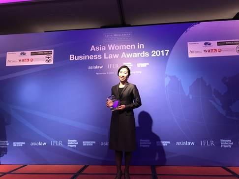 법무법인 광장의 오현주 파트너 변호사가 지난 9일 홍콩 JW메리어트 호텔에서 열린 'ASIA Women in Business Law Awards 2017'에서 ‘최고의 여성변호사 멘토링 프로그램’상을 수상한 뒤 기념촬영하고 있다.사진/광장