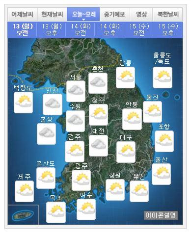 13일 기상청에 따르면 남해상에서 동진하는 고기압의 영향을 받다가 북쪽을 지나는 기압골의 영향으로 오후부터 전국이 차차 흐려지겠다. 밤부터 내일 새벽 사이에는 서울과 경기, 강원 영서, 충청, 호남지역에서 비가 내릴 전망이다.