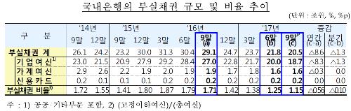 19일 금융감독원이 발표한 3분기말 국내은행의 부실채권 현황(잠정)에 따르면, 올 3분기말 국내은행의 부실채권비율은 1.15%로 2분기(1.28%) 대비 0.10%포인트 낮아졌다. 지난해 3분기(1.71%) 대비로도 0.56%포인트 개선됐다.