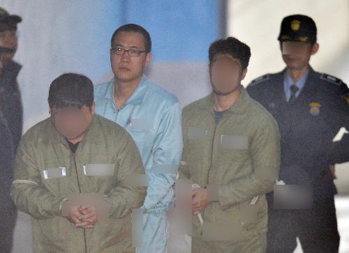 여성 변호사 폭행 사건으로 고발당한 김승연 한화그룹의 삼남 김동선(왼쪽 두번째) 씨가 지난 1월 '주점 종업원 폭행사건'으로 구속 기소된 뒤 첫 공판을 받기 위해 서울 서초구 서울중앙지법으로 들어서고 있다. 사진/뉴시스