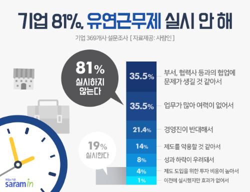 27일 사람인에 따르면 기업 369개사를 대상으로 ‘유연근무제 실시 현황’에 대해 조사한 결과, 81%가 ‘실시하지 않는다’라고 답했다.