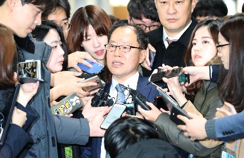 박근혜 전 대통령 국선변호인단의 조현권 변호사를 비롯한 국선변호인단이 27일 오전 서울 서초구 서울중앙지방법원에서 열린 국정농단 사건 90차 공판에 출석, 재판이 연기돼 법정을 나서며 취재진 질문에 답하고 있다. 사진/뉴시스